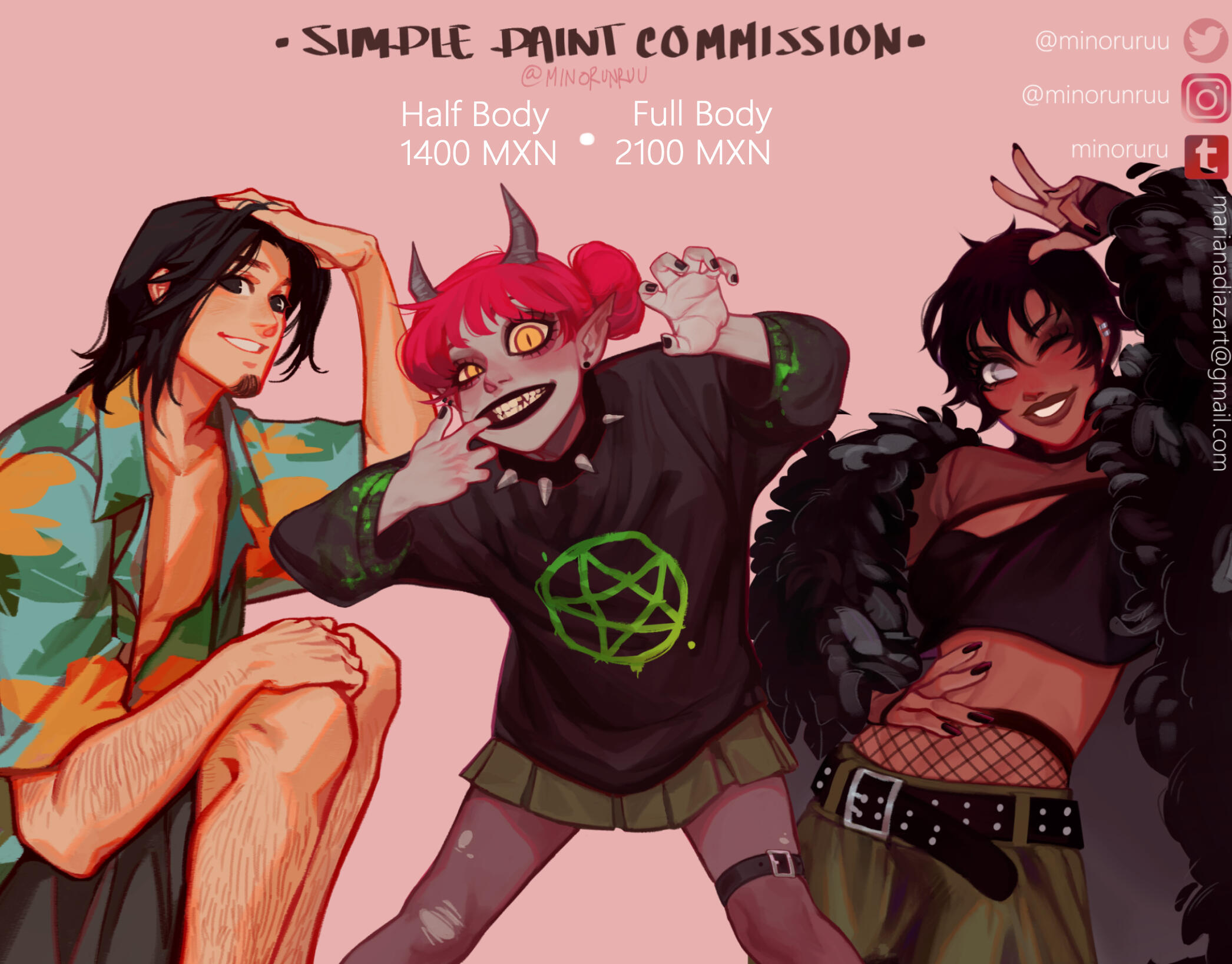 I have different artistic styles that I enjoy doing, so the result can range from colored sketches with background; something more cartoonie to something more realistic; it can also go from a bust to a full body.